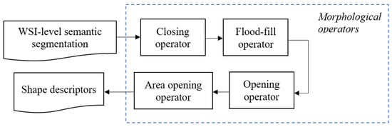 Morphological operators sequence applied to the output masks from the semantic segmentation network. The output of the morphological post-processing is used for calculating shape descriptors to eventually perform clustering.