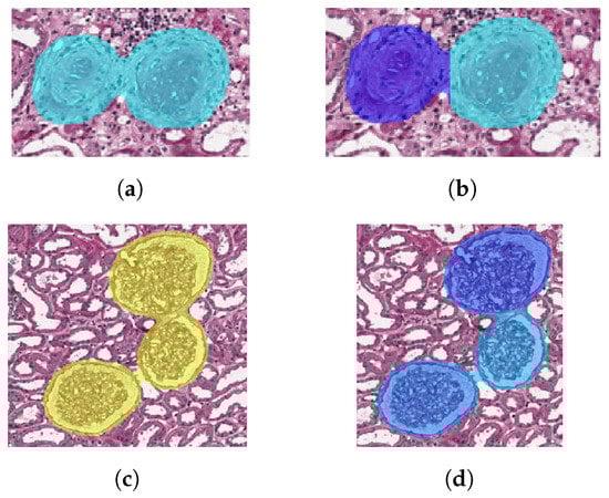 We decide the number K of clusters according to deltaArea: if deltaArea ≤ 900, ; if deltaArea > 900 and deltaArea ≤ 5000, ; if deltaArea > 5000, . The values of deltaArea and the corresponding K have been empirically determined on the trainval set. Confusion matrices reported later have been obtained after the clustering with the configuration based on deltaArea. Examples of glomeruli before clustering are depicted in Figure 6a,c. The corresponding images after clustering are shown in Figure 6b,d.