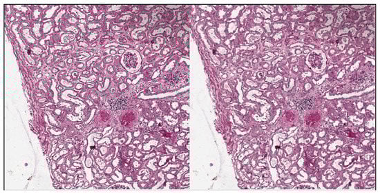 Tellez et al. analyzed the problem of stain color variation in digital pathology very deeply [31]. They proposed different solutions for both stain color augmentation and stain color normalization. In this work, we exploited techniques proposed by them such as morphological transformations and Hue-Saturation-Value (HSV) shifts. An interesting morphological transformation is the elastic deformation; it was originally proposed by Simard et al. [32] for the analysis of visual documents, and then has had a widespread application in medical imaging, as also shown by U-Net authors [28]. We used elastic deformation to generate plausible alterations of glomeruli shapes, increasing the variability of training images and thus reducing the risk of overfitting. An example of elastic deformation applied to our images is depicted in Figure 7. Examples of HSV shift are depicted in Figure 8.