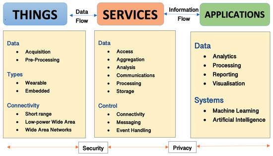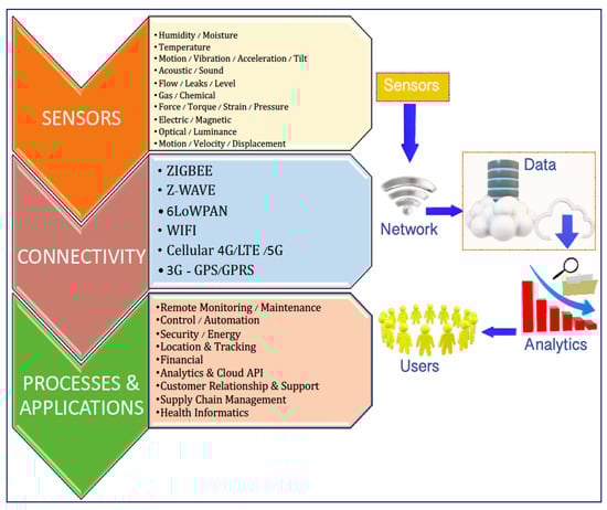 The Internet of Things is one of the key disruptive technologies in the Industry 4.0 era [1]. There is a growing trend to use the Internet of Things (IoT) in scientific and industrial communities [2,3]. There are many definitions proposed for the IoT, in general, the IoT can be described as a confluence of various technologies that provide Internet-based services and applications with the help of electronics devices connected to physical things for the purpose of collecting data through heterogeneous sensors, for controlling processes [4]. IoTs are being used in many applications in various fields, from environmental monitoring, health care, agriculture and manufacturing sectors [5,6,7]. IoTs have evolved from being a just a connection and communication point for acquiring the data of physical objects to comprehensive smart systems that are capable collecting enormous amounts of data and monitoring various processes for maximising the profits for organisations and individuals. An abstraction of the Internet of Thing’s (IoT) architecture is shown in Figure 1.