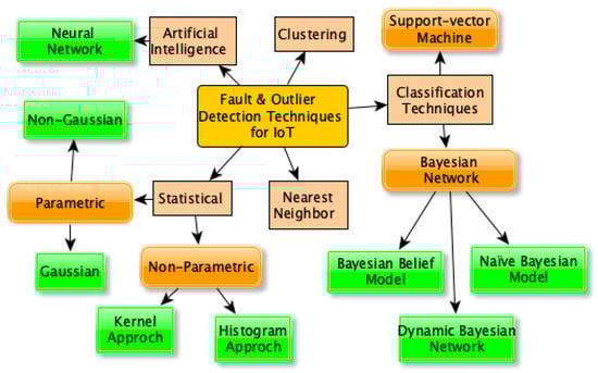 Sensor failure detection and outlier identification in an IoT context started to gain considerable attention in the research community. In general, there are five macro-classes of automatic sensor outlier and failure detection techniques that can be used in an IoT context as shown in Figure 5. In this section, the sensor fault and outlier detection techniques for IoTs are discussed, based on the disciplines like statistical-based techniques, nearest-neighbour-based techniques, machine learning and artificial intelligence-based techniques, clustering-based techniques and classification-based techniques.