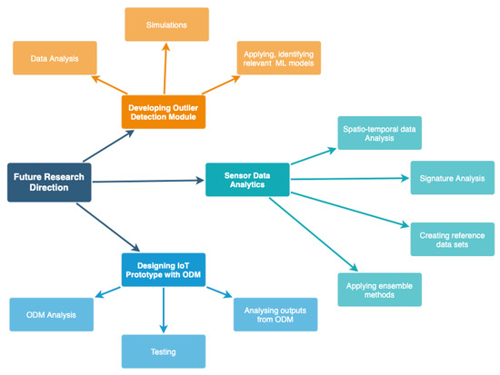 In this section, the open research questions and the future research directions in developing the sensor faults, outlier detection models for IoT is discussed. The future research is directed toward tackling three areas: analysing the sensor’s produced spatial-temporal data in real time, developing IoT—sensors relevant to Outlier Detection Modules (ODM) and developing an IoT prototype with embedded ODM for testing, as shown in Figure 8 below.