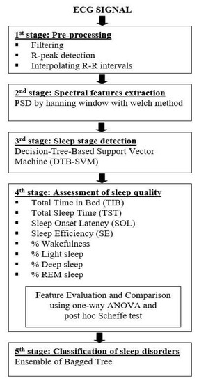 The proposed method consists of five-stages, as shown in Figure 1. The first stage is the pre-processing of the ECG signal. Afterward, we extract the spectral features from the ECG signal in the second stage. The third stage is the sleep stage detection process by applying the DTB-SVM. The assessment of sleep quality performs in the fourth stage. In the final stages, sleep disorder classifies using an ensemble of bagged tree classifier. We use Matlab software for all computations in the proposed method.