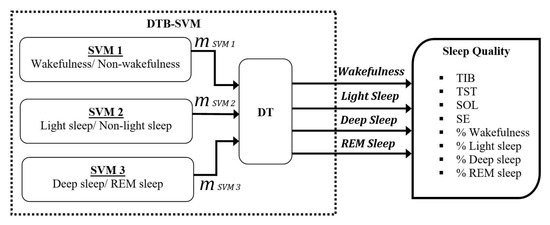 In this stage, the DTB-SVM is used to detect the sleep stage. DTB-SVM is a combination of SVM and Decision Tree (DT) [38]. The learning function form of NN and SVM is statistically the same. A single hidden layer of NN uses the same model with an SVM. SVM is a machine learning algorithm that uses the structural risk minimization principle for estimating the objection function. It is performed by minimizing the upper bound of the generalization error. The SVM attempts to seek an optimized linear division, that is, construct a hyperplane that is then used to separate the classes. The general equation of SVM in defining the hyperplane y(a) is given in Equation (3), where, w is the support vector, a is the input vector, and b is the bias term.