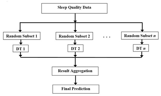 In this fifth stage, we use an ensemble of bagged tree classifier for classifying sleep disorders, namely, healthy, insomnia, SDB, and RBD. An ensemble of bagged tree classifier is a combination of the bagging algorithm and decision tree classifier [49]. The ensemble method is a machine learning technique that combines multiple machine learning classifiers that aims to improve the classification performance, robustness, and reduced over-fitting problem [50]. The Bagging algorithm (or bootstrap aggregation) is one of the most common ensemble methods [51]. The Bagging algorithm is the most accurate and efficient ensemble method compared to boosting and random forest because it can reduce a high variance of the algorithm, such as the decision tree algorithm [52]. Thus, the Bagged Tree algorithm is a bootstrap procedure implemented in the decision tree (DT) algorithm. The general scheme of the ensemble of bagged tree classifier illustrates in Figure 5. As shown in Figure 5, sleep quality data that consists of healthy, insomnia, SDB, and RBD disorders are used as the training data. Then, we divide this training data randomly into n new training data (random subset). Each random subset is used to train one DT classifier. Each DT classifier consists of a root, interior nodes, and leaf nodes. The interior nodes correspond to the attributes, and the leaf nodes correspond to decision results.