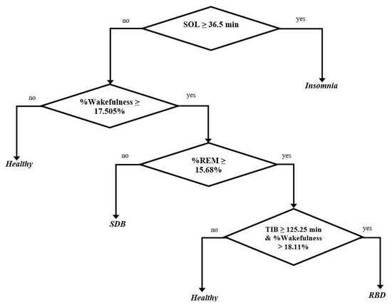 Figure 6 shows the trained model of the ensemble of bagged tree classifier in classifying four classes of sleep disorders: healthy subjects, patients with insomnia, SDB, and RBD. The SOL is used to determine patients with insomnia. We found that most of the patients have a higher duration of SOL (above 36.5 min) than others feature. It corresponds to a recent clinical study result [55] that reported elderly patients with insomnia (65 years or older) have more than 30 min of quantitative SOL criteria. Moreover, AASM also has treatment goals to reduce the SOL of insomnia patients with at least lower than 30 min [56]. This treatment aims to improve sleep quality.