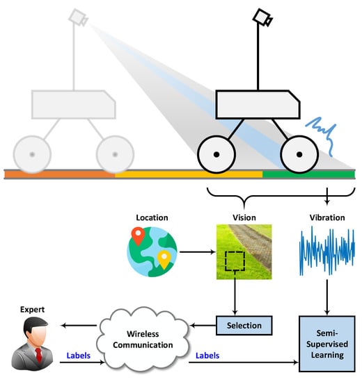 Because a robot may be equipped with shock absorbers, the vibration sensors are preferred to be mounted on the axle. Hence, vibration data and the corresponding image of terrain patch could be matched. As terrain type is defined in terms of its appearance by a human, the robot could send the terrain images to a human and request labels. Field robots are designed to execute tasks in fields which are far from urban areas, and a field robot cannot guarantee reliable and fast communication, so it is impracticable for the robot to request all the manual labels. As a result, only a small portion of the terrain images are labelled manually, and a semi-supervised learning method will be employed to train the classifier after the labels arriving.