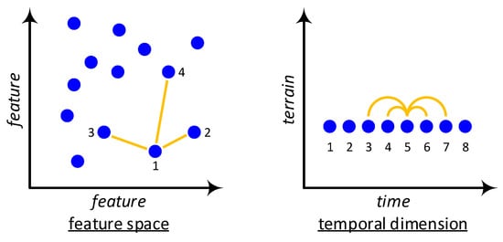 where denotes the weight and denotes a given nonlinear function. The weight coefficient selects which homogeneity is more convinced. For example, if terrain switches from one type to another more frequently over time, should be greater because of the weaker temporal correlation. The nonlinear function , e.g., , could increase the similarity between two samples which are similar both in feature space and temporal dimension.