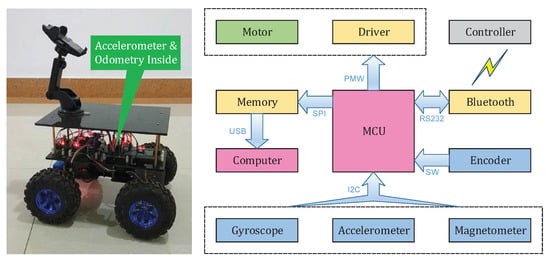 The photograph and electronic system structure of the experimental four-wheeled mobile robot.