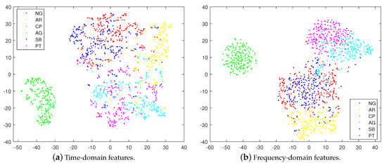 We visualise our data through t-distributed stochastic neighbour embedding (t-SNE). As shown in [], t-SNE is a non-linear technique for dimensionality reduction that is particularly well suited for the visualisation of high-dimensional datasets. The t-SNE minimises the divergence between two distributions: a distribution that measures pairwise similarities of the input objects and a distribution that measures pairwise similarities of the corresponding low-dimensional points in the embedding. The Kullback–Leibler (KL) divergence of the joint probability of the original space and the embedded space is used to evaluate the quality of visualisation effect. That is to say, the function of KL divergence is used as a loss function, and then the loss function is minimised by gradient descent, and finally the convergence result is obtained.