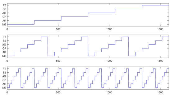 As shown in Figure 6, we split the terrain sequence into segments and concatenate them into a new rearranged terrain sequence. We use dwelling time to describe the terrain switching frequency. It is observed that the terrain sequence implicates temporal correlation; i.e., the next terrain has the same type as the current type very possibly. From top to bottom, each terrain dwells for 264, 66 or 22 sampling points, respectively. In the following experiment, we will show the influence of classification accuracy by different dwelling times.