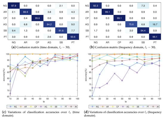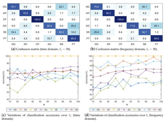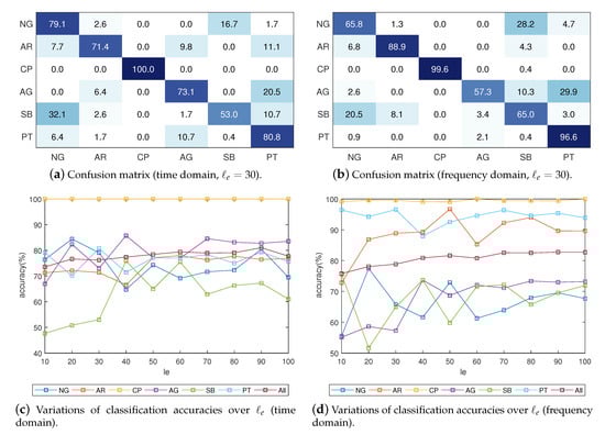 The experiment results of t-LapSVM under LS1 are shown in Figure 8. Using time-domain features and , the total classification accuracy is 76.21%, so the classification is almost not improved from SVM to t-LapSVM. Comparing Figure 8a with Figure 7a, it is observed that some confusions are weakened and some are strengthened. This is because the unlabelled data could be labelled correctly if the feature-space homogeneity holds; otherwise they may be labelled incorrectly. As Figure 5a shows, the data of different classes intersect partially; i.e., the feature-space homogeneity does not hold. Therefore, the data which could be correctly predicted by SVM may not be predicted correctly by t-LapSVM. Although increasing the number of labelled samples, the classification cannot be improved, which is observed by comparing Figure 8c with Figure 7c. The total classification accuracy using frequency-domain features is 78.85% under . Observing Figure 8b,d, it is found that the classification performs worse by introducing semi-supervised learning. Hence, inappropriate utilisation of unlabelled data may cause a deterioration in classification. In Table 1, we present the classification performances with different parameters of t-LapSVM. It was observed that changing the values of , , and did not cause a significant variation in classification performance, which may reveal that the assumption of feature-space homogeneity is invalid.