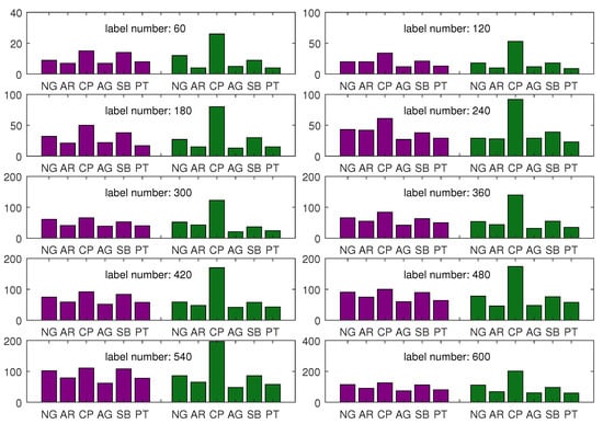 Distribution over classes of labelled samples generated by LS2. Green bars stand for time domain and purple for frequency domain. Y axis represents the number of the sample.