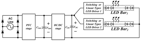 The power conversion system for driving a large-power LED in a series–parallel structure is shown in Figure 1. Large power LED lights over 65 W require AC/DC converters for power factor correction (PFC), along with DC/DC converters to create isolation and DC voltage to drive those LEDs connected in series. Finally, to balance the current between parallel-connected LED strings, a linear or a switching LED driver is required. The linear LED driver has simple control and low cost, but suffers from poor efficiency [3]. The switching LED driver, which is a type of non-isolated DC/DC converter, separately controls the current of each LED string. It has higher efficiency compared with the linear LED driver, but has demerits, such as a large component count and high cost [4,5,6]. Both linear and switching LED drivers require a large number of circuits to drive parallel LEDs. The number of the circuits can be reduced by series-connected LED strings. Even if the number of current driving circuits is reduced by connecting the LED strings connected in parallel to each other in series, a high driving voltage LED driving circuit is required. In addition, there are two power conversions for a DC/DC converter and current drive, which also causes efficiency degradation.