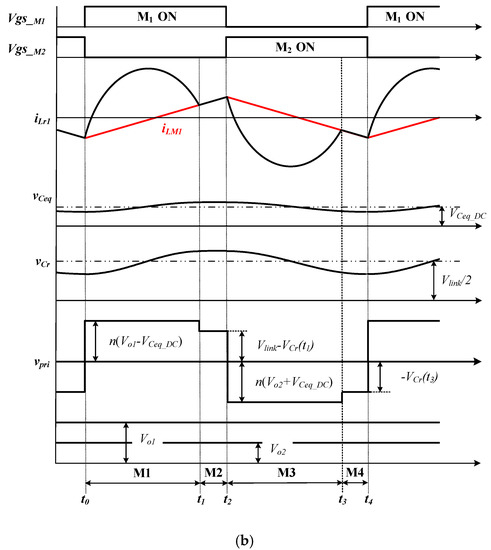 Figure 2 shows the circuit diagram and key waveforms of the proposed a stacked single-ended two channel LLC LED driver. The proposed driver can be extended for many channel LEDs. A more detailed driver circuit expansion for multiple LEDs will be discussed again in Section 2.2. The operation and structure are explained in this section through the proposed two-channel LED driving circuit. The proposed converter is composed of two single-ended rectifiers, a balancing capacitor, and two series LED strings. The current deviation in series with the two modules is compensated by the balancing capacitor, and the voltage stresses of D1 and D2 can be made equal. The operation is similar to the LLC converter. For mode analysis, the following assumptions are made.