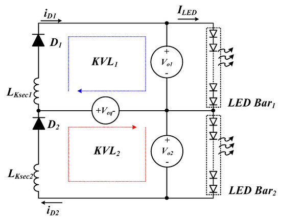 The current between LED bar 1 and LED bar 2 can be equalized by the balancing capacitor, Ceq. During one switching cycle from t0 to t4, the net changes in capacitor voltage Veq are zero. The voltage difference between LED bar 1 and bar 2 can be compensated for by the DC voltage of Ceq. The voltage of Ceq is determined by the leakage inductance of secondary transformer windings and the equivalent resistance of LED bars. The equivalent circuit to determine the DC voltage of Ceq is shown in Figure 3, where the current equations for iD1 and iD2 can be obtained by using Kirchhoff’s voltage law for LED bar 1 and LED bar 2 for each half cycle.