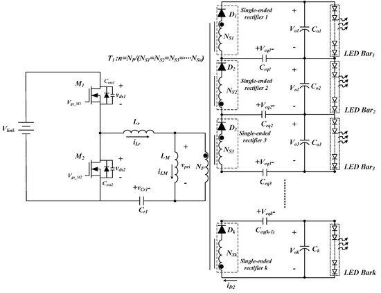 In order to overcome the efficiency degradation and to drive multi-channel LEDs, a single power conversion driver has been studied from the PFC DC output to the LED current control [7,8,9,10,11,12,13,14,15,16,17]. The single power LED driving circuit can be divided into a conventional pulse-width modulation (PWM) DC–DC converter [7,8,9,10,11,12] and a resonant converter [13,14,15,16]. A multichannel LED driver is proposed, based on a multi-output flyback converter. Each LED string is connected to a separate secondary winding of a flyback transformer, while each LED string is connected to each other through a current balancing capacitor [8]. However, this prior circuit cannot be applied for high voltage and power LED driving, because of high voltage and current stress in a primary switch. A study has proposed buck and boost converters for driving the single power conversion multichannel LED [9,10,11,12]. The proposed method uses many devices to drive multichannel LEDs, and the study presents several methods for current control for each channel. These prior research methods are not suitable for high-power, multi-channel LED driving circuits because of the large number of devices, and the need for a separate control block to eliminate the current variation between channels. Another study has proposed driving multi-channel LEDs using series resonance and parallel resonance on the secondary side or on the primary side [13,14,15]. The prior circuits have many reactive components to make an LCL-T resonance rectifier or LCLC series–parallel resonance for the current balancing of LED strings. In addition, some multichannel LED drivers based on the LLC resonant converter have been studied [16,17,18]. One study [16,17] offers a two-stage, multi-channel, constant current (MC3) LLC LED. The current balancing is ensured by transformers that are connected in series at the output of the resonant tank, but the circuit separates the LED modules through a transformer, and it is difficult to balance the current between the modules. Another LLC resonant-based single power conversion LED drive circuit has been studied [18]. This circuit can easily eliminate the current deviation between LED strings, but the secondary side wiring is difficult, and too many parts are used, which makes it expensive and bulky. To achieve high efficiency, the zero-voltage switching of the primary side switch is required, and a small number of secondary side diodes should be used, even if the LED channel is increased to reduce the conduction loss of the large power LED driver.