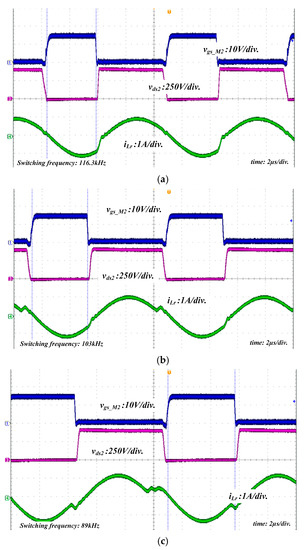 A prototype of 260 W, two-channel LED bars with 400 V input voltage was built to verify the operation and features of the proposed LLC LED driver. The components are shown in Table 2. Figure 5 shows the experimental setup. Figure 6 shows the resonant inductor currents with 10% difference of the equivalent resistance of the LED bars. The switching frequency is almost the same as the resonance frequency, with no difference in the LED bars. When the equivalent resistance of LED bar 1 is 10% greater than that of LED bar 2, the operation is above resonance. Conversely, the operation is below resonance. This means that the LED current deviation can be compensated like the conventional LLC average current control [17,19]. According to the variation of the LED bar’s resistance between −10% to +10%, the current of the LED bars and the voltage of the Ceq is measured in Figure 7a,b. Even if there is a current deviation between LED bars, the switching pulse frequency modulation can cause a DC voltage change of Ceq to achieve the current balance. As shown in Figure 7b, the experimentally-obtained current balance capacitor voltage is very similar to the theoretical value using Equation (10), depending on the LED bar’s resistance deviation. Additionally, changing the current–balance capacitor voltage with the LED bar’s resistance deviation means that the diode’s voltage stress will be equal. High efficiency above 96% in high-voltage LED driving is shown in Figure 7c. Table 3 shows a comparison between output power and efficiency using the prior resonant and proposed converters. In the proposed circuit, current compensation according to the number of channels can be easily achieved by adding current balancing capacitors, diodes and windings. Therefore, even if the number of channels differs from the previous studies, the proposed circuit can achieve high efficiency with a small number of devices, as shown in Table 3, despite the large variation in the LED bar’s resistance. The proposed driver has the highest efficiency at 260W output power. This results from ZVS switching of MOSFET and low diode conduction loss by reduction of the number of components.