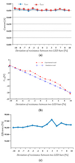 Experimental results. (a) Current according to the deviation of two LED bars’ resistance, (b) VCeq according to deviation of two LED bars’ resistance (c) Efficiency.