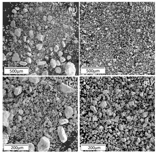 SEM images of (a,c) 100-mesh bismuth particles and, (b,d) 200-mesh bismuth particles.
