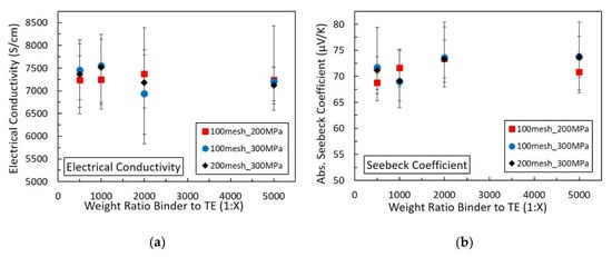 In Figure 3a, the highest electrical conductivity value (7550 ± 520 S/cm) was obtained from the 1:1000 binder to 100-mesh bismuth weight ratio TE composite films that were pressed at 300 MPa. The lowest electrical conductivity value (6940 ± 540 S/cm) was obtained from the 1:2000 binder to 100-mesh bismuth weight ratio TE composite films pressed at 300 MPa. We also pressed 200-mesh 1:500 weight ratio of binder to particles at 5 MPa and 50 MPa and the electrical conductivity was (871 ± 220 S/cm) and (4770 ± 670 S/cm), respectively. The electrical conductivity of the TE films that were pressed with higher pressure (≥100 MPa) was much higher and, as a result, we used higher pressures of 200 MPa and 300 MPa to maximize the electrical conductivity.