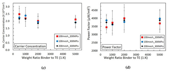 Figure 3c shows the measured absolute values of charge carrier concentration. The power factor of each TE film was calculated with the equation, , and the averages of the power factor of various combinations are plotted in the Figure 3d. The overall power factor values were relatively similar. The highest power factor value (4010 ± 390 μW/m·K2) was obtained from the 1:2000 binder to 100-mesh bismuth weight ratio TE composite film that was pressed at 300 MPa. However, no significant difference was observed in terms of power factor by changing the weight ratio, grain size, or external applied pressure. The overall power factor of chitosan-bismuth TE composite films was in the range of 3500–4000 μW/m·K2. This value is two orders of magnitude higher than epoxy-bismuth composite films [25]. In this work, we use the energy efficient method to achieve high electrical conductivity in contrast to other reported work for composite films and achieved electrical conductivity that was similar to bulk values. Based on the electrical conductivity and the Seebeck values of bulk bismuth [35,36], the power factor of chitosan-bismuth composite films in this work should be similar to that of bulk bismuth.