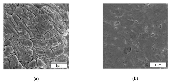 We performed SEM of TE composite films with 1:2000 wt. ratio of binder to 100-mesh Bi particle at 300 MPa to understand the effect of pressure on electrical conductivity. Figure 4b shows the cross-sectional SEM images. For comparison purposes, we have performed SEM on 1:500 wt. ratio of binder to 100-mesh Bi particles composite films at low pressure (5MPa). Figure 4a shows the cross-sectional SEM images. The reason of choosing very low-pressure (5MPa) in contrast to high pressure (300 MPa) is that we wanted to see the grain and grain boundaries orientation in TE composite films under the application of low and high pressure. Under the application of low pressure 5MPa, we can easily see many grains and grain boundaries as shown in Figure 4a which result in charge carrier scattering and resulted in low electrical conductivity 870 S/cm. The applied external pressure facilitates particle coalescence and the formation of a bulk like structure since Bi is a ductile metal. However, it is interesting to note that both 100-mesh and 200-mesh Bi composite films have comparable electrical conductivity at high external applied pressure (200 MPa and 300 MPa). Moreover, the electrical conductivity was high for chitosan Bi TE composite films (100-mesh and 200-mesh) at 200 MPa and 300 MPa and the same as Bi bulk material [35,36]. The external applied pressure helped to densify the films and remove the pores and voids. Therefore, the electrical conductivity for different mesh and different weight ratio TE composite films has high electrical conductivity.