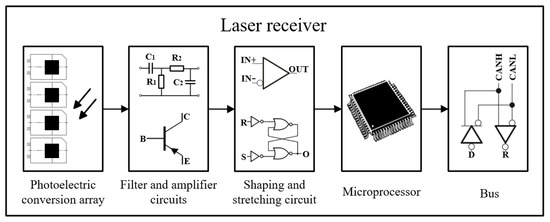 The structure of the laser receiver is shown in Figure 1. It consists of a photoelectric conversion array, filter and amplifier, shaping and stretching circuits, a microprocessor, and a bus.