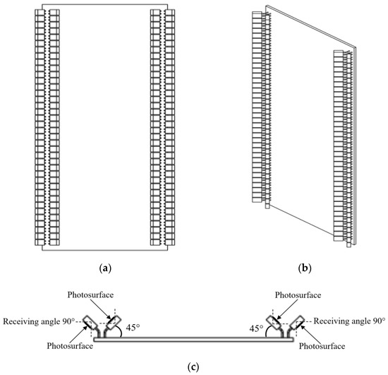 Schematic of the arrangement of the photoelectric conversion array. (a) Front view, (b) solid view, (c) top view.