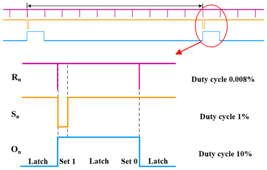 To facilitate the microprocessor to process the data, the filtered and amplified signal needs to be shaped and pulse stretched. First, a differential comparator is used to convert the filtered and amplified signal into a transistor–transistor logic (TTL) signal, with a frequency of 10 Hz and a duty cycle of 1%. Second, a trigger signal with a frequency of 100 Hz and a duty cycle of 0.008% is used to trigger the tri-stable R-S latch, to achieve pulse stretching. The principle is shown in Figure 3. When the shaped input signal Sn is at a low level and the trigger signal Rn is at a high level, the output signal On is at a high level. When the shaped input signal Sn is at any level and the trigger signal Rn is at a low level, the output signal On is at a low level. When the shaped input signal Sn is at a high level and the trigger signal Rn is at a high level, the output signal On is in a latched state. The trigger signal Rn stretched the duty cycle of the input signal Sn 10 times, that is, the duty cycle was stretched from 1% to 10%.