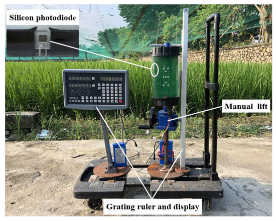 The laser beam spot diameter measurement test that can be detected by the laser receiver was carried out at the research base of the South Chinese Agricultural University in Guangzhou. The test scheme and main equipment are shown in Figure 5. As shown, the laser receiver installed on the manual lift contains only one silicon photodiode that can detect the laser signal (other silicon photodiodes are covered by a black film). When the laser beam transmission distance is 10 m, 20 m, …, 190 m, and 200 m, the elevation position of the laser receiver is adjusted by the manual lift (accuracy = 0.05 mm), and the digital grating ruler (accuracy = 5 μm) is used to measure the laser beam spot diameter that can be detected by the laser receiver.