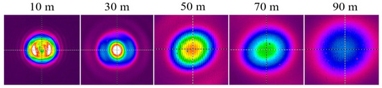 The laser beam spot images at the transmission distances of 10 m, 30 m, 50 m, 70 m, and 90 m, are shown in Figure 6. As the transmission distance increases, the spot of the laser beam continues to diffuse and forms a multistage amplified light ring.