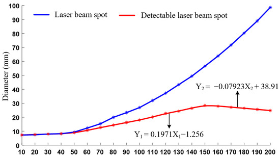 The comparison of the actual and detectable laser beam spot diameters are shown in Figure 7 for transmission distances in the range of 10–200 m. The transmission and diffusion law of the laser beam spot diameter is consistent with that of the Gaussian beam spot diameter (expressed by Equation (4)), but it is significantly different from the corresponding law of the detected laser beam spot diameter. When the transmission distance is in the range of 10–50 m, the range of the laser beam spot diameter that can be detected is 6.85–8.93 mm. When the transmission distance is in the range of 50–150 m, the fitting equation of the detectable laser beam spot diameter is Y1 = 0.1971X1−1.256 (R2 = 0.9985), and the spot diameter is increased from 8.93 mm to 28.53 mm. When the transmission distance is greater than 150 m, the laser beam spot diameter gradually becomes smaller, and the fitting equation of the detectable laser beam spot diameter is Y2 = −0.07923X2 + 38.91(R2 = 0.9978).