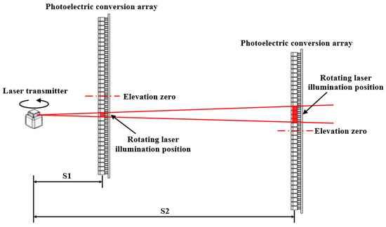 A schematic of the rotating laser illumination photoelectric conversion array is shown in Figure 8. When the photosensitive surface of a silicon photodiode is illuminated by the rotating laser, the elevation deviation is calculated as the error between the center position of the illuminated silicon photodiode and the zero position of the laser receiver. As the transmission distance increases, the laser beam spot diameter becomes larger, and when the photosensitive surface of multiple silicon photodiodes is illuminated by the rotating laser at the same time, the elevation deviation is calculated as the error between the centers’ positions of the illuminated multiple silicon photodiodes and the zero position of the laser receiver. This calculation method can accurately obtain the geometric center elevation position of the laser beam spot image, and it can effectively reduce the calculation error of elevation deviation caused by the laser beam spot diffusion.