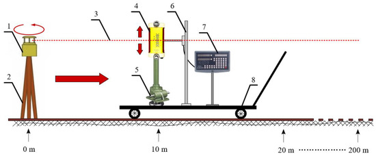 Schematic of testing setup. (1. Laser transmitter, 2. Tripod, 3. Laser reference, 4. Laser receiver, 5. Manual lift, 6. Grating ruler, 7. Data display instrument, and 8. Trolley.).