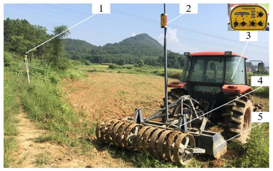 In June 2019, a dry land levelling test was conducted in the Qingyuan City in the Chinese Province of Guangdong, whereby the test field was approximately 60 m long, 30 m wide, had an area of approximately 1800 m2, and was sun-cured for more than 24 h after rotary tillage. The drill and laser grader [29] are shown in Figure 10. The tractor was a Kubota M704KQ, and the laser transmitter was a Topcon RL-H4C. To reduce the elevation adjustment oscillation of the scraper, the accuracy of the laser receiver was set to ±9 mm.
