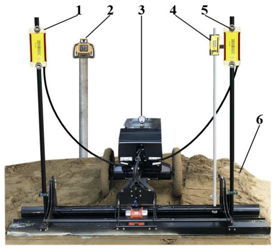Test site of concrete levelling. (1. Left laser receiver, 2. Laser transmitter, 3. Concrete leveler, 4. Level sensor, 5. Right laser receiver, and 6. Sand bed).