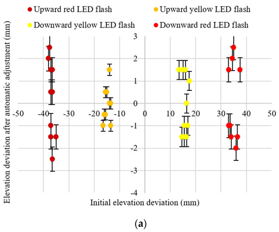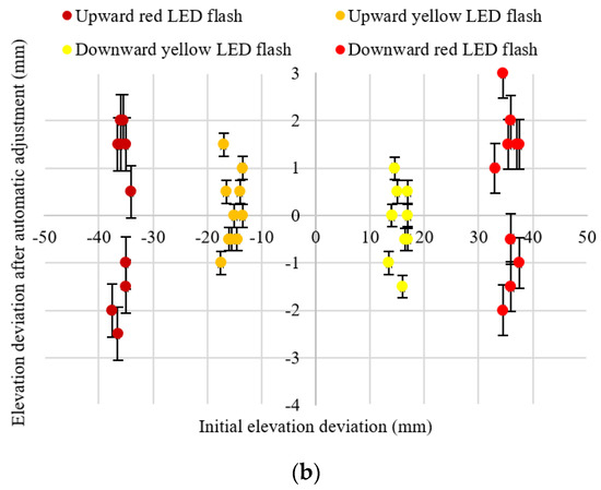 Test data scatter plot of the deviation of the elevation adjustment. (a) Left laser receiver, (b) Right laser receiver. (Note: The laser receiver had five sets of elevation light-emitting diodes (LED), and four states were used in the test, including the upward red LED flash, upward yellow LED flash, downward yellow LED flash, and downward red LED flash.)