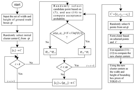 Before developing the YOLOv3 model, it is necessary to determine the width and height of bounding box priors ( and in (4) and (5), respectively), as they directly affect the performance of the YOLOv3 method. In the YOLOv3 method, it uses k-means clustering algorithm to select the representative width and height of bounding box priors to avoid consuming much time in adjusting the width and height. The complexity of k-means clustering method is expressed as for the data based on dimension and cluster centers, whereby is the number of data. The larger the dataset, the more time-consuming the modelling process. In addition, the YOLOv3 method is sensitive to the initial cluster center. To overcome this problem, we apply the AFK-MC2 method [] in order to estimate the width and height of bounding box priors.