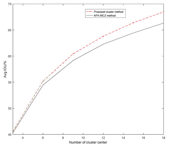 Below, we compare the performance of the proposed cluster method and AFK-MC2 method in terms of estimating the initial width and height of predicting boxes. The length of the Markov chain used in simulations for two methods is 200. We have also tried to increase and decrease the length of the Markov chain. When the length is increased, the Avg IOU and running time are also increased. When the length is decreased, the Avg IOU and running time are also decreased. For simplicity, we used 200 as the length of the Markov chain that is also used in []. On the MS COCO datasets, the Avg IOUs obtained by our proposed method and the AFK-MC2 method are shown in Figure 2: it can be seen that our proposed method has a larger Avg IOU than that of the AFK-MC2 method for a different number of cluster centers. This means that the proposed method has better performance than the AFK-MC2 method in terms of estimating the initial width and height of predicting boxes.