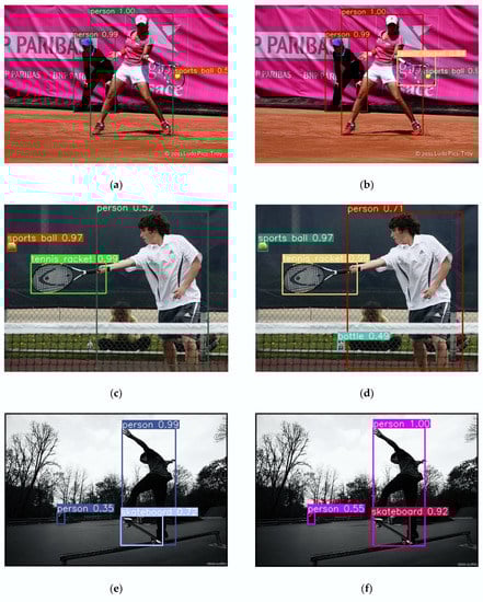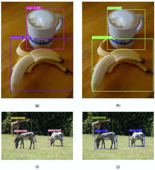 We also randomly selected five images from the test sets of the MS COCO dataset in order to test the performance of small object detection; the object detection results are shown in Figure 3. Subfigures (a), (c), (e), (g) and (i) show object detection results generated using the original YOLOv3 method, and subfigures (b), (d), (f), (h) and (j) show the object detection results generated using our proposed method. For the first image, the YOLOv3 method detected three objects, while our proposed method detected four objects (subfigures (a) and (b)). With the second image, the YOLOv3 method detected three objects, while our proposed method detected four objects (subfigures (c) and (d)). For the first and second image, our proposed method detected more objects, and it has higher scores in terms of detecting small objects. With the third image, the YOLOv3 method and our proposed method detected three objects (subfigures (e) and (f)), and our proposed method has higher scores in terms of detecting objects, especially small objects such as people in the distance and skateboards. With the fourth image, the YOLOv3 method and our proposed method detected two objects (subfigures (g) and (h)), and our proposed method has higher scores in terms of detecting objects, especially cups. With the fifth image, the YOLOv3 method and our proposed method detected three objects (subfigures (i) and (j)), and our proposed method has higher scores in terms of detecting objects, especially the giraffe in the distance. These ten sub-figures indicate that our proposed method has better performance in terms of detecting objects, especially for some small objects such as sports balls, tennis rackets, bottles, people in the distance, skateboards, cups, a giraffe in the distance, etc.