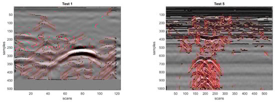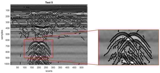 As mentioned in the Introduction, this paper focuses on the introduction of Canny operator into APEX for a fast and effective processing of GPR radargrams. In particular, to speed up the execution of APEX or other algorithms for automated hyperbola detection and characterization, it is obviously useful to eliminate as many unimportant pixels as possible from the radargram under test, in the initial stage of the procedure; Canny edge detector looks like an excellent candidate to achieve this objective.