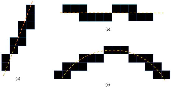 Figure 3. Illustrative schemes, showing typical clusters of edge pixels obtained after the application of Canny edge detector to GPR data: (a) group of edge pixels that can be fitted by using a linear function with non-zero slope; (b) group of edge pixels that can be fitted by using a linear function with zero slope; (c) group of edge pixels that can be fitted by using a second-order curve. - Groups of edge pixels that can be fitted by using linear functions with zero slope (Figure 3, case b).
