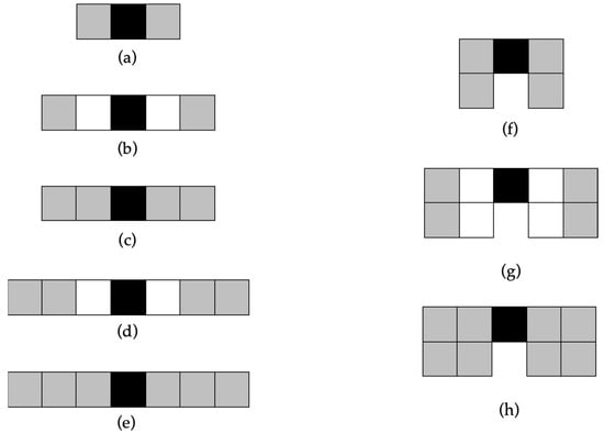 To find an appropriate size and shape of the image portion (hereinafter called “search zone”), the alternatives shown in Figure 4 were considered. In those pixel combinations, the black square is a given edge pixel, grey squares represent pixels included in the proposed search, and white squares represent other image pixels (grey and white squares can, therefore, be edge pixels, or not). From (a) to (e), the search zone extends over a single image line and three to seven columns: in (a) and (b) the number of pixels included in the search zone is the same, but the search zone occupies a wider area in (b); in (c), the search zone extension is the same as in (b), but more pixels are considered; in (d), the number of pixels is the same as in (c), but the search zone is further extended; in (e), the search zone extension is the same as in (d), but more pixels are considered. From (f) to (g), the search zone extends over two image lines and three to five columns: in (f) and (g) the number of pixels included in the search zone is the same, but the search zone occupies a wider area in (g); in (h), the search zone extension is the same as in (g), but more pixels are considered.
