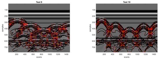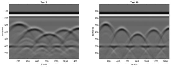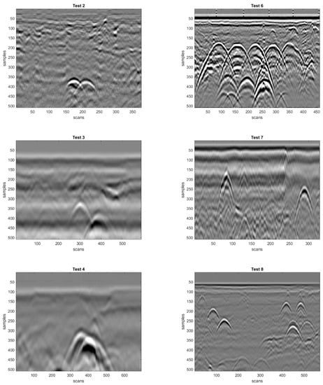 All radargrams are shown in Figure 5 and Figure 6. The eight experimental radargrams presented in Figure 5 were obtained during real GPR surveys carried out in urban areas, in Belgrade, in the presence of different utilities. The two synthetic radargrams of Figure 6 belong to the Open Database of Radargrams of COST (European Cooperation in Science and Technology) Action TU1208 [6], namely Radargram #9 is obtained by scanning Concrete Cell 1.1 proposed in [60], whereas Radargram #10 is obtained by scanning an enlarged version of the same structure [28].