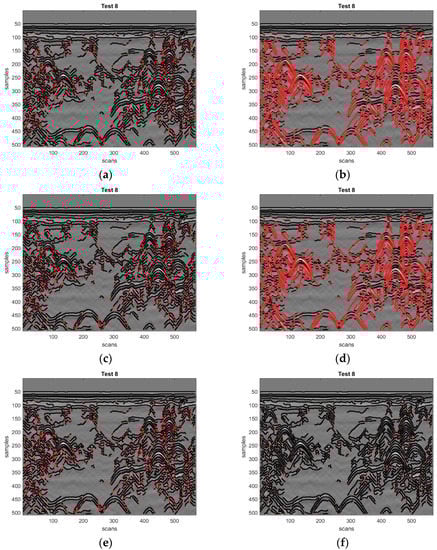 The results obtained for the other radargrams are rather consistent with those presented in Figure 7. From a careful analysis of all the results obtained, we have observed that the only “error” (i.e., removal of useful pixels) occurred when processing Radargram #7 by using search zone (b): in that unfortunate case, all pixels in the vicinity of a hyperbola apex were removed. For this reason, we think that search zone (b) should not be used. Search zones (d) and (g) appear to be more robust than (b), and this is obviously due to the fact that they include a higher number of pixels; at the same time, they are more effective than search zones (a), (c), (e), (f), and (h), which produce the removal of a number of pixels that is too low for our purposes.