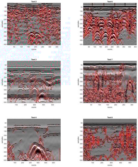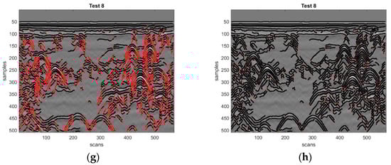 In Figure 7, an example is presented, where the procedure described in Section 2.3 is applied to Radargram #8. Showing the complete set of results for every radargram and every search zone would be redundant; since Radargram #8 is among the most complex experimental datasets considered in this paper, the results of Figure 7 are representative enough. In the figure, the edge pixels found by the Canny edge detector are superimposed to the grey-scale map of the original radargram. The proposed procedure for the removal of unnecessary edge pixels is applied by using the eight search zones of Figure 4. The black edge pixels are retained, whereas the red pixels do not satisfy the condition and are removed before sending the radargram to the next steps of the APEX algorithm. A visual inspection of the results presented in Figure 7 reveals that the degree of pixel elimination using search zones (a), (c), (e), (f), and (h) is significantly lower than when search zones (b), (d), and (g) are used. Whether the pixels adjacent to the central one are included or not in the search zone, has turned out to be a distinguishing property that has significant consequences on the number of pixels removed. It can be also appreciated that no edge pixels located in the vicinity of hyperbola apices are removed. This is important for the effectiveness of the subsequent stages of the APEX algorithm, when the exact positions of the apices have to be found. The largest number of eliminated pixels (more than 50% on average) belong to the hyperbola prongs and to other irregular reflections or noise existing in the radargram considered.
