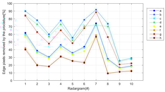 Figure 10 shows the percentage of edge pixels removed by the procedure presented in Section 2.3, for all the considered radargrams and all the search zones. Figure 11 shows the processing time for all the considered radargrams and all the search zones.