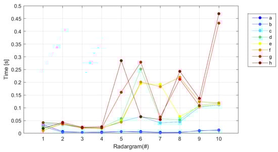 By observing Figure 11, it is apparent that the smallest search zones (a) and (b) correspond to the shortest execution times, while the execution of the procedure takes a slightly longer time when a wider search zone is used (as expected). However, it can be noticed that there are no significant differences in terms of execution time when different search zones are used, especially for radargrams that contain a not too high number of edge pixels. The processing time is longer in the presence of a higher number of edge pixels in the Canny processed radargram; usually, larger radargrams contain a higher number of edge pixels (as shown in Table 2). The average processing time for the search zones that remove the highest number of pixels are: 0.01 s, 0.08 s, and 0.14 s, respectively, for search zones (b), (d), and (g). It has to be mentioned that the processing time plotted in Figure 11 includes the Canny edge detection, as well. If this process would be excluded, the time would decrease of approximately two thirds; i.e., the application of the procedure for the removal of unwanted edge pixels takes about one third of the time shown in Figure 11. Since the maximum processing time is less than half a second, it can be concluded that the proposed processing approach is an excellent candidate to become the initial stage of an upgraded version of APEX, which will be capable of yielding results in near real-time. To calculate the processing time shown in Figure 11, the embedded MATLAB function etime was used.