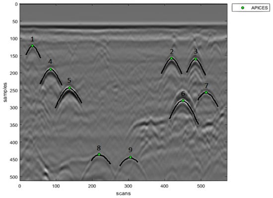For the sake of completeness, an example of detection, localization and prong tracing results obtained by using APEX is now presented. In Table 3, the coordinates of the hyperbola apices found by APEX in Radargram #8 are reported in terms of image pixels; results obtained with the original and upgraded versions of APEX are compared (for the upgraded version of the algorithm, search zone (d) was used). First of all, it can be noticed that both versions of the algorithm detected nine apices. The horizontal coordinates of the apices are almost the same (i.e., the column values, which indicate the spatial position along the radar acquisition line): in fact, the absolute difference between original and new results is between 0 and 2 pixels. As far as the vertical coordinates of the apices are concerned (i.e., the row values, which indicate the position along the time axis), the absolute difference between original and new results is between 4 and 5 pixels. Since the time window for this radargram is 56 ns and the number of rows is 505 (Table 1), one pixel corresponds to 0.11 ns. In Figure 12, the apices found by the new version of APEX are represented by green dots and superimposed to Radargram #8; moreover, the black pixels are the hyperbola prongs traced by APEX. This figure clearly illustrates the effectiveness and accuracy of the algorithm.
